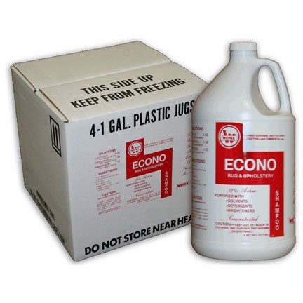 High-foam detergent for use with rotary-style machines or light scrub brushes to clean carpet. Works up to a dry foam for mopping or vacuuming away. Fortified with solvents, detergents, and brighteners. Directions for use: vacuum the carpet, check for color fastness, pre-spot, dilute according to label, scrub carpet pile, allow to dry and vacuum again. Dilution rates: HEAVY SOIL: 1-12 or 10 oz. per gallon of water MEDIUM SOIL: 1-16 or 8 oz. per gallon of water LIGHT SOIL: 1-32 or 4 oz. per gallon of water. BUY PER GALLON OR CHOOSE A CASE OF FOUR GALLONS.
